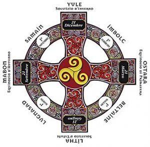 Namentlich konnte ich noch zwei weitere Götter ausmachen, die sogar ihre eigenen Feste im Jahreskreis haben. Ich möchte mit einer kurzen Vorwegnahme zur Erklärung des Jahreskreises beginnen. Das Symbol des Jahreskreises konnte ich illustrieren, so dass ich es Ihnen zeigen kann, da er sehr umfangreich ist. Auch wird es sehr oft als Schmuckstück, oder vielleicht auch als tragbarer Kalender benutzt. Das ganze Jahr spiegelt sich auf diesem Kreis wieder, es wird auch heute noch von den Bewohnern Nuiras als Kalender benutzt, die Tage dazwischen werden oft nicht einmal gezählt. Was mich zugegebenermaßen sehr irritiert hat, ist dass das Fest links oben, bzw. am 1. November, Samain, als Jahresanfang gezählt wird. Der Bedeutung der einzelnen Feste widme ich mich später in einem gesonderten Kapitel, dennoch war der kurze Einblick wichtig zum Verständnis. Nun kann ich wieder zu den beiden noch fehlenden Göttern zurückkommen.